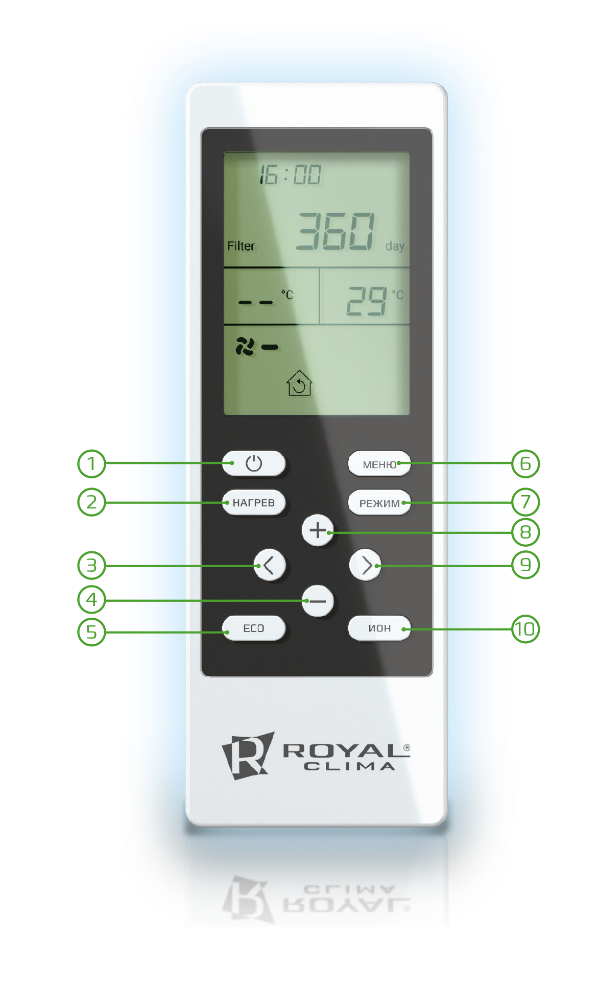 Пульт дистанционного управления позволяет быстро изменять рабочие параметры приточно-очистительного комплекса. С его помощью вы можете регулировать температуру воздуха, скорость вентилятора, выбирать режим работы и устанавливать таймер. Пульт имеет оптимальные размеры и удобно лежит в руке, а на широком дисплее отображаются все рабочие параметры.