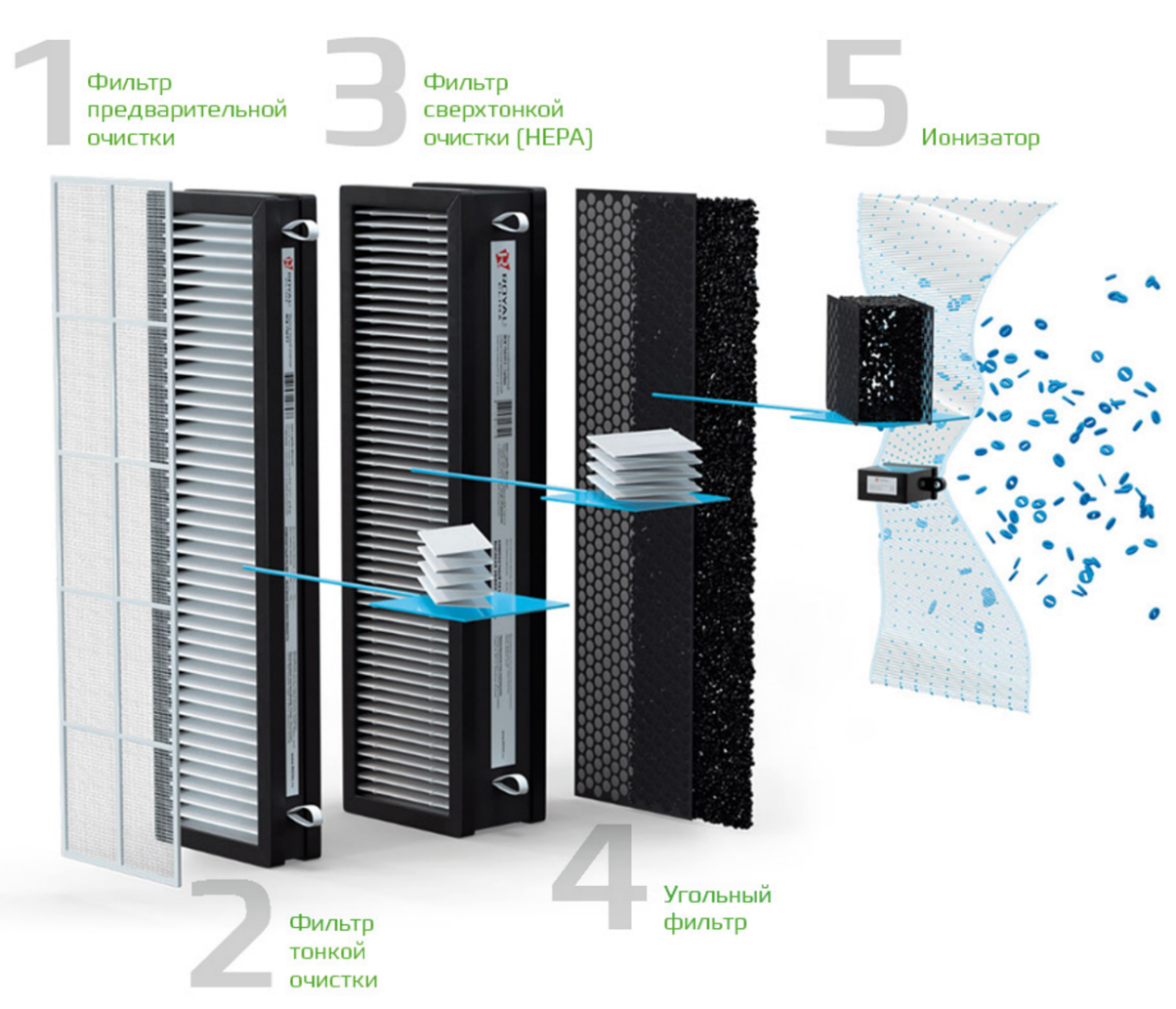 Эффективная очистка воздуха обеспечивается 5-ступенчатой системой фильтрации, которая препятствует проникновению в помещение неприятного запаха и задерживает мельчайшие частицы пыли и аллергенов, очищая воздух до 99,5%.